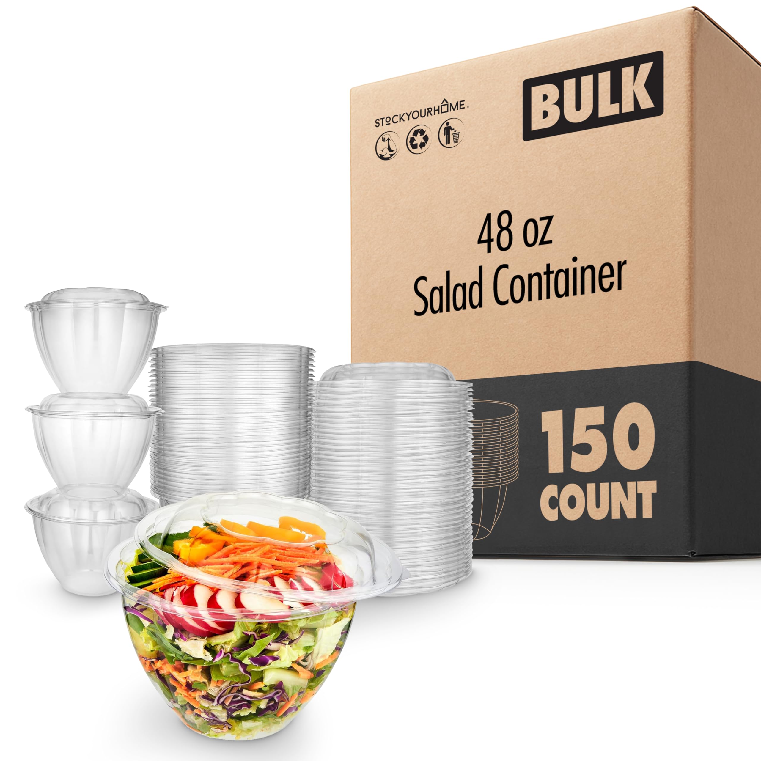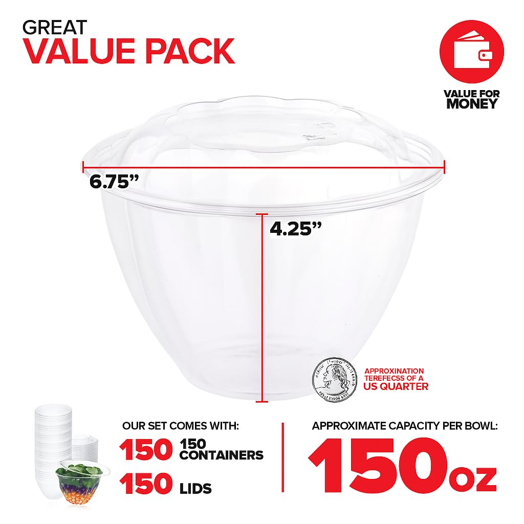 - Great Value Pack: Comes with 150 salad containers and 50 lids. Each container has a 48-ounce capacity. Measures approximately 6.75” Top Diameter x 4.25” Height.