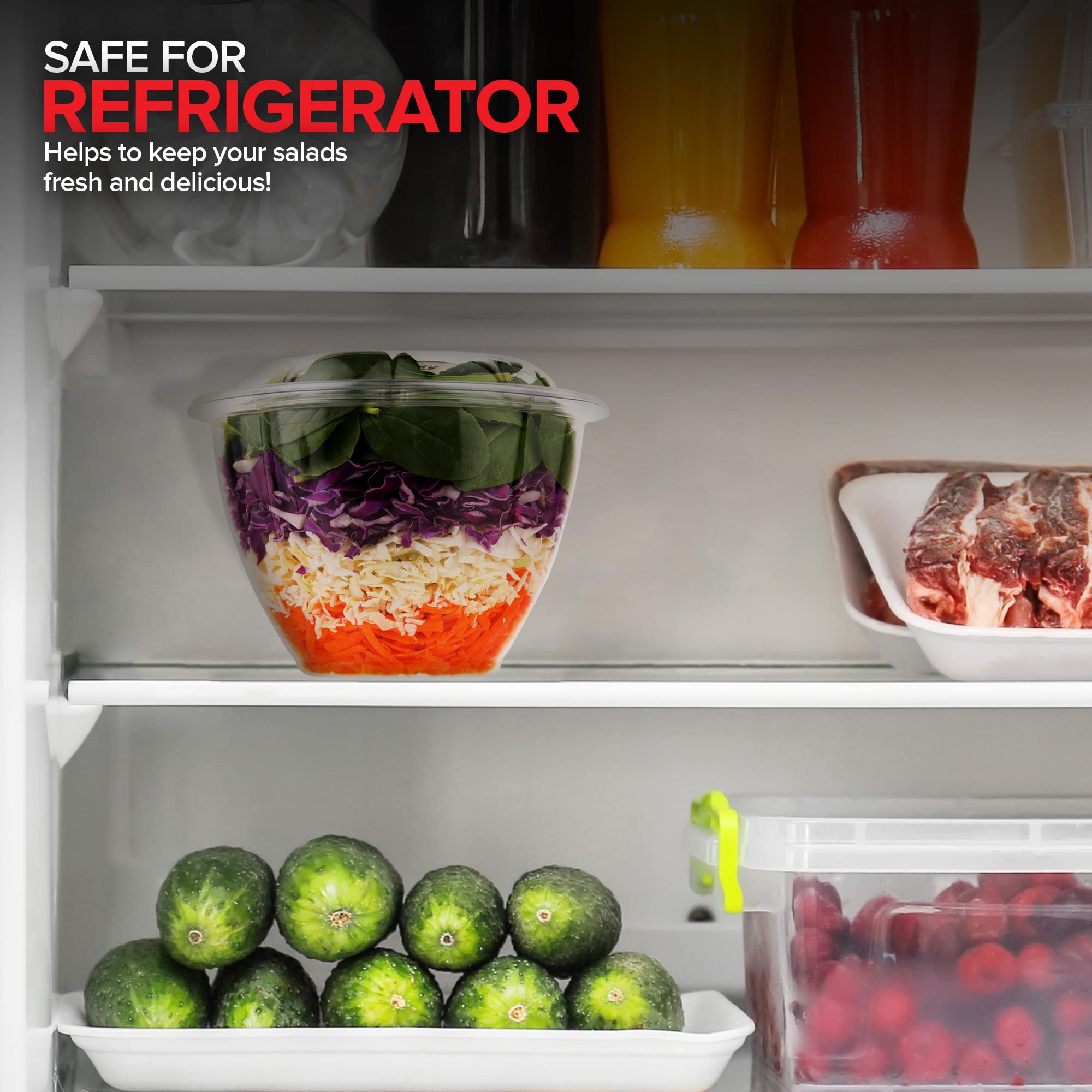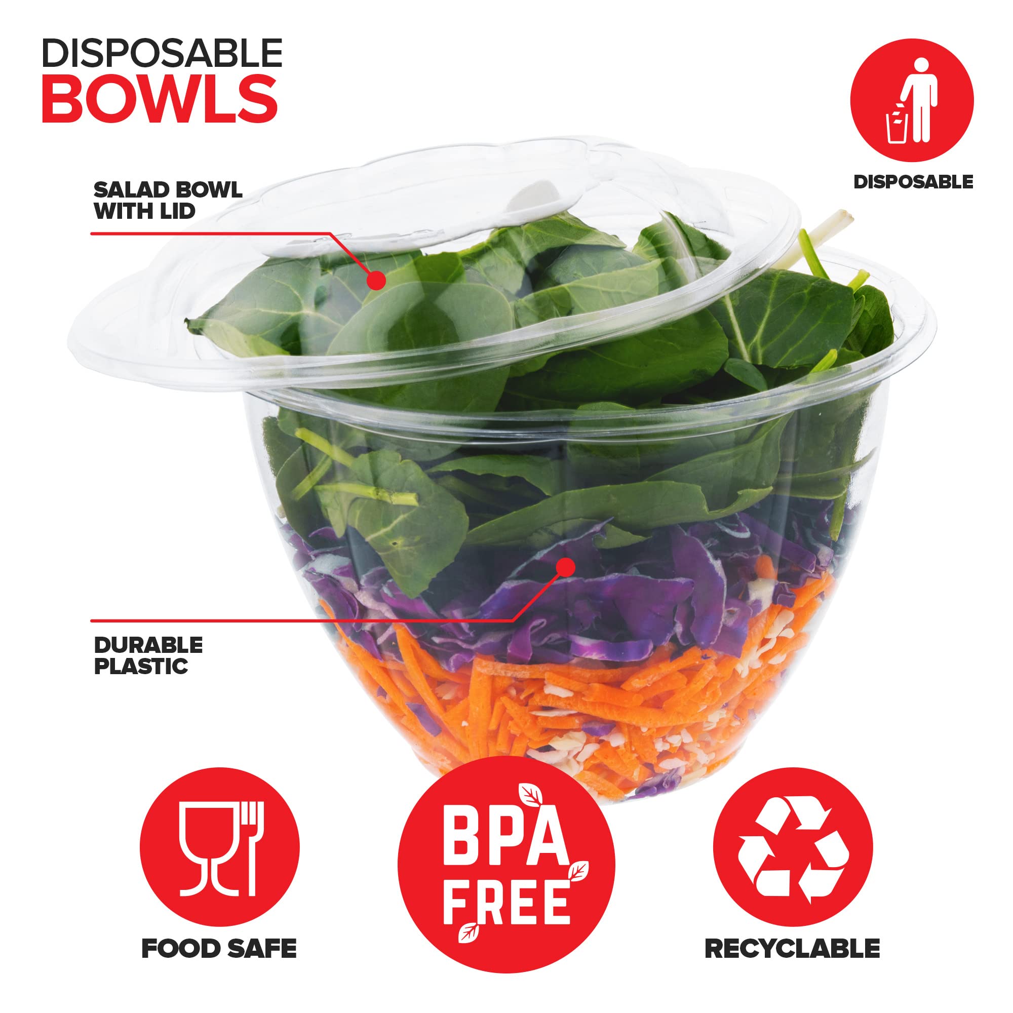 - Disposable: Made of durable plastic, our large salad bowls with lids are BPA-free, food safe, and recyclable. When you're done, simply toss them in the trash for easy clean-up.