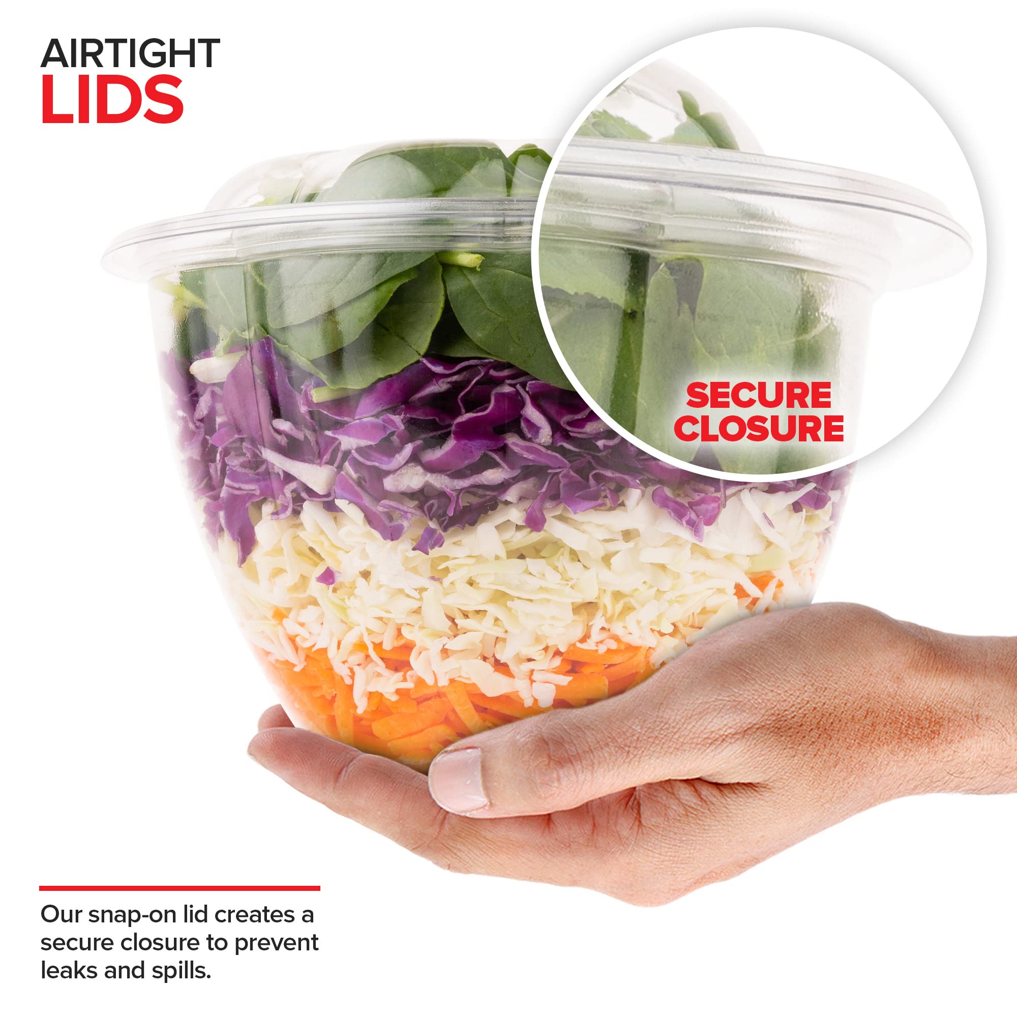 - Airtight Lids: Our snap-on lid creates a secure closure to prevent leaks and spills. This also helps keep your salads fresh and delicious!
