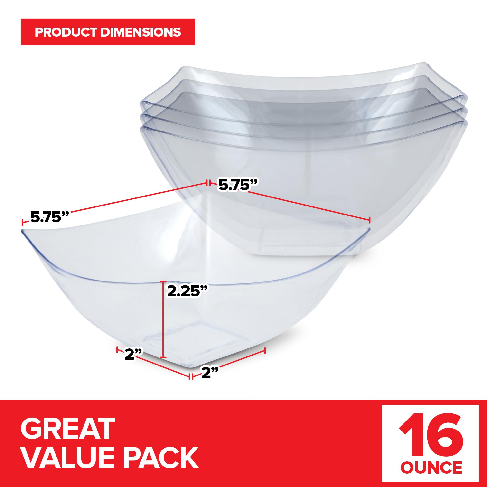 - Great Value Pack: Comes with a set of 48-16 ounce bowls. Measures approximately 5.75”W x 5.75”L at the top, 2”W x 2”L at the bottom, and 2.25”H.