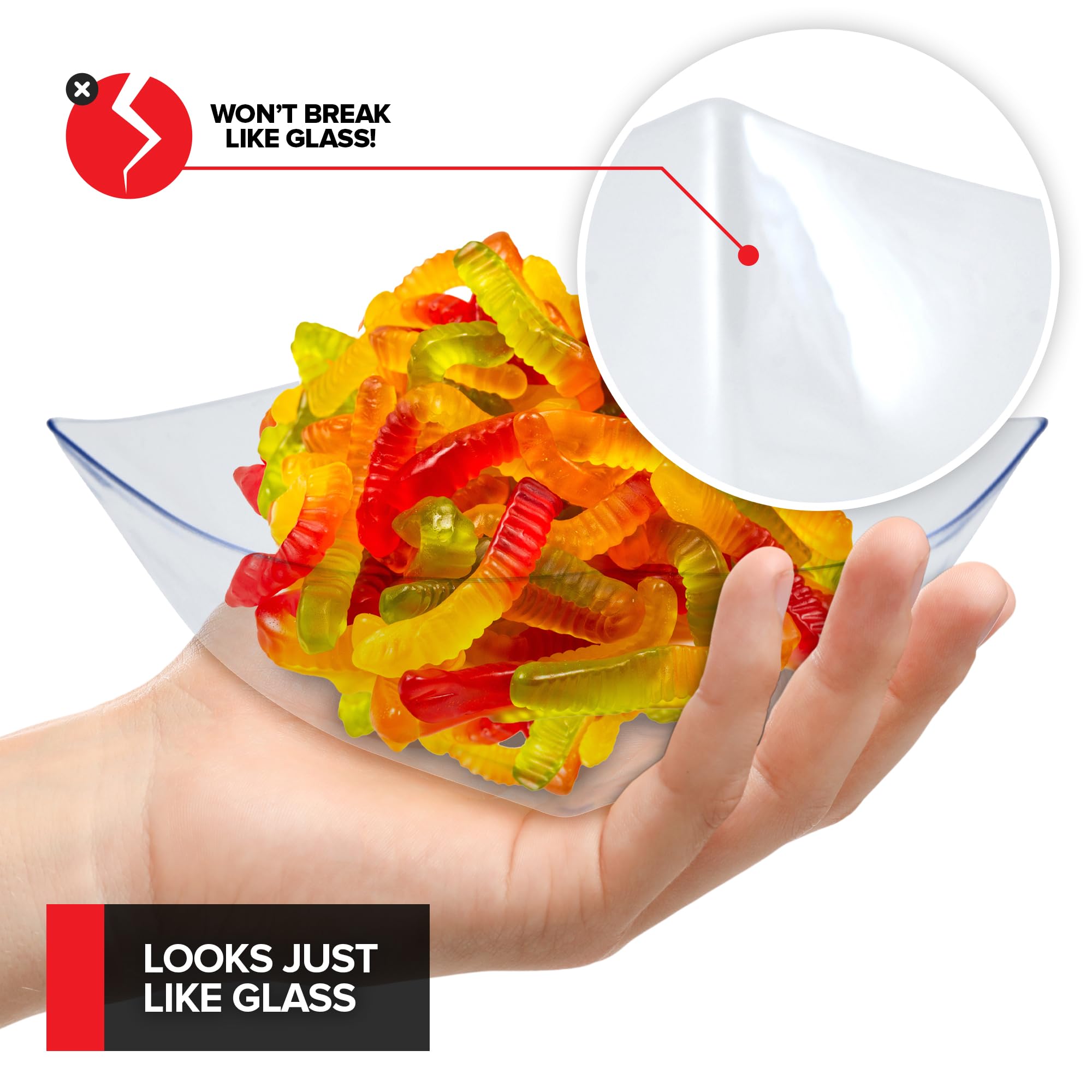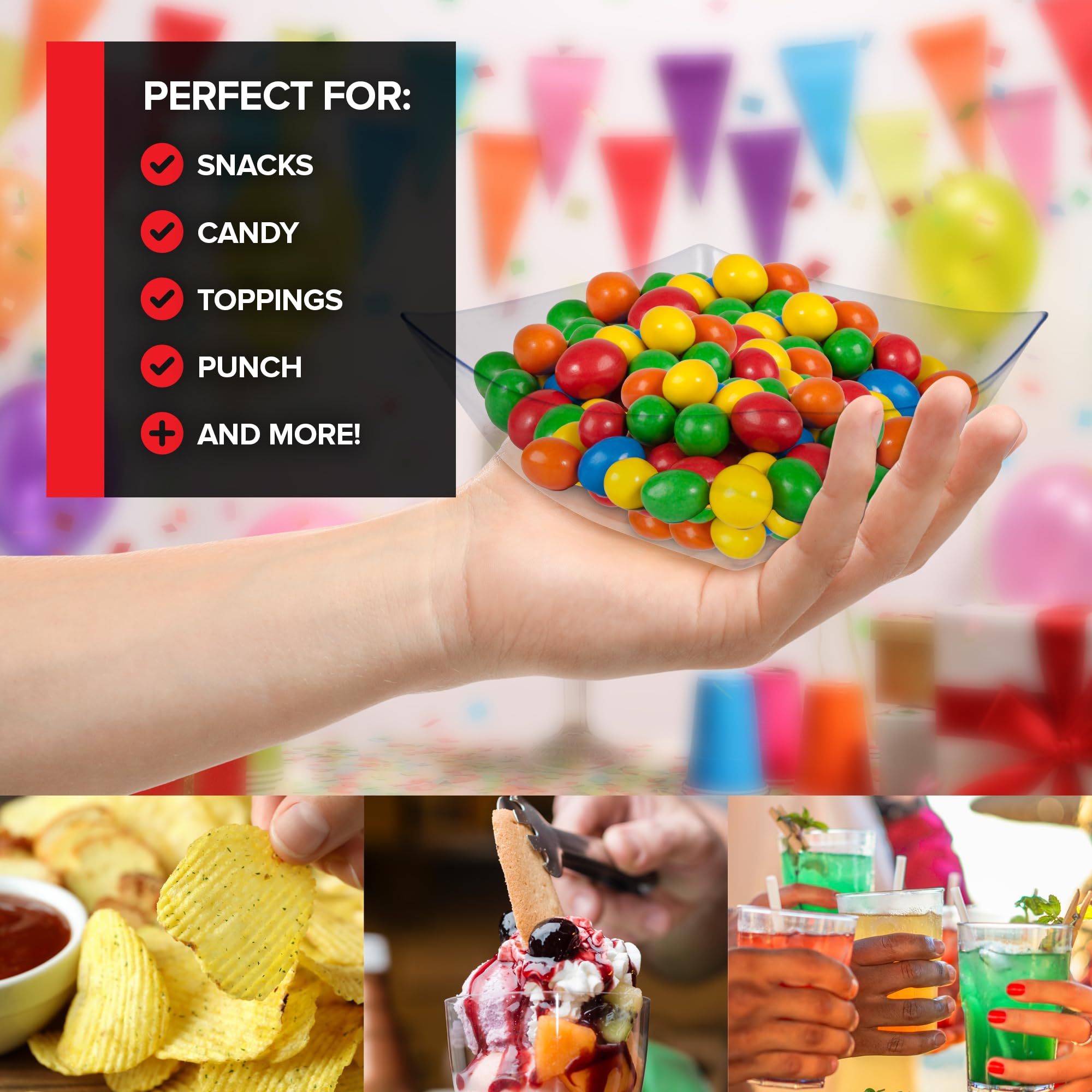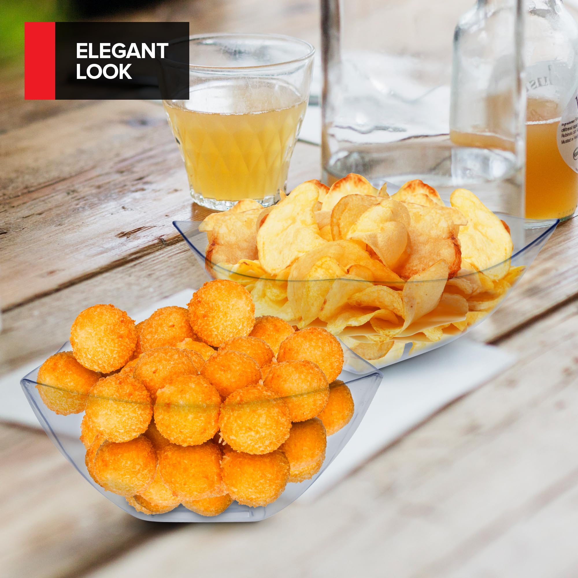 - Elegant & Chic: Our clear square bowls have an appearance like glass, without the worry of them breaking. Our clear plastic bowls are perfect for serving punch, chips, popcorn, pretzels, mints, and other snacks.