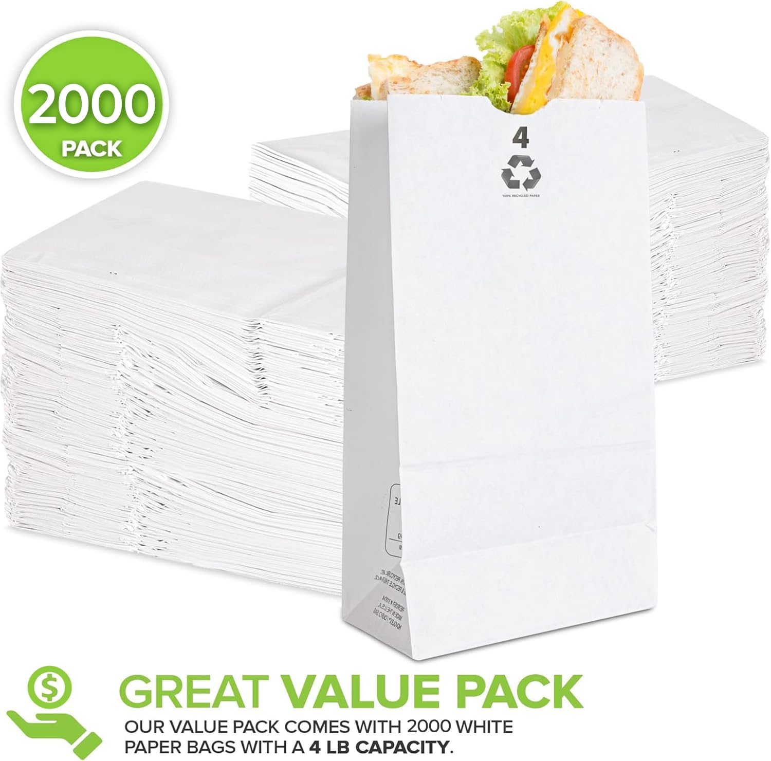 • Great Value Pack: Our value pack comes with 2000 kraft white paper bags with a 4 Lb capacity. Dimensions: 5