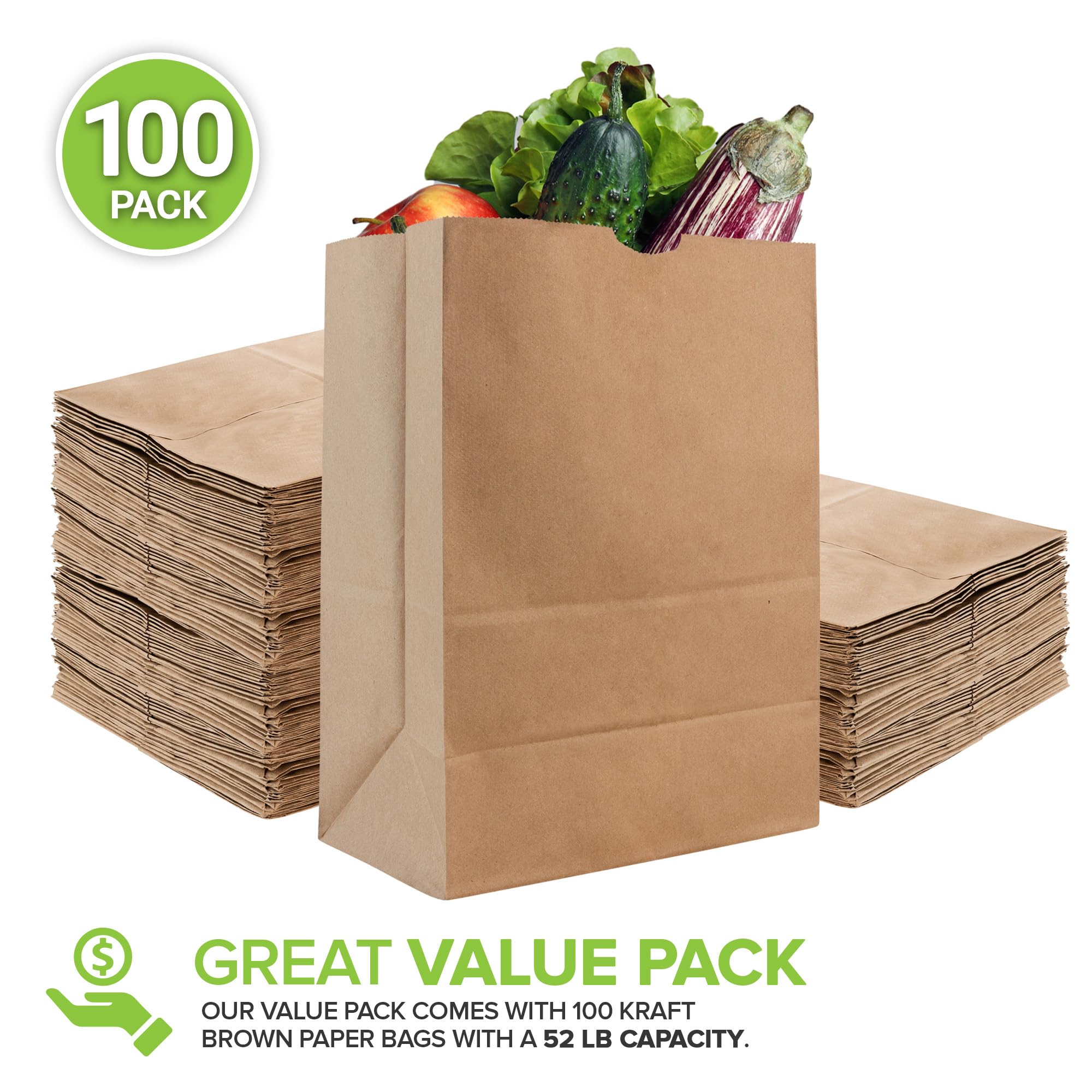 - Premium Quality: Made of certified food grade kraft brown paper, our 52lb bags are great for packing food, storing food, and taking food on the go. Designed with a flat square bottom, our bags can stand on their own, making it easier for packing and displaying food. Perfect for supermarkets, grocery stores, delis, restaurants, and more.