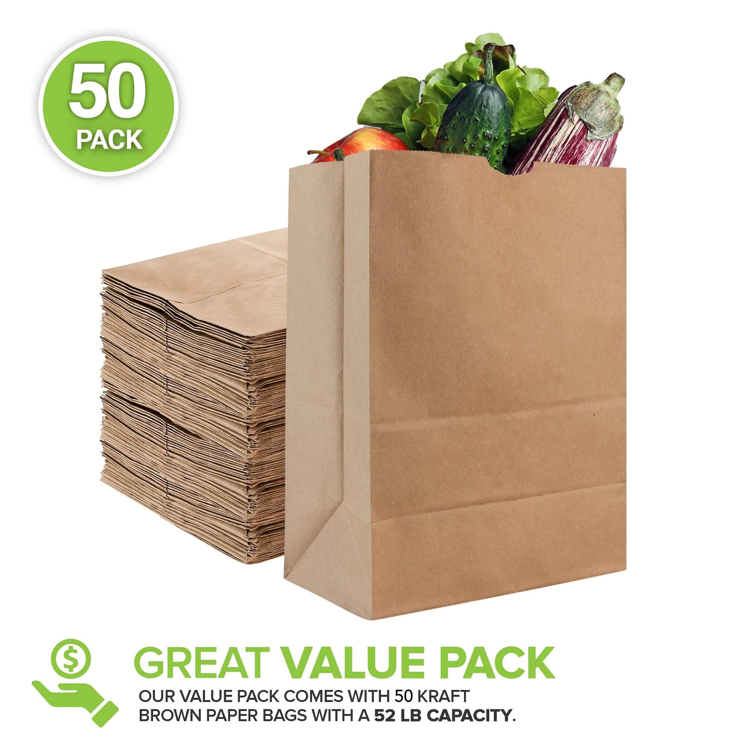 - Great Value Pack: Our value pack comes with 50 kraft brown paper bags with a 52 Lb capacity. Dimensions: 10.5