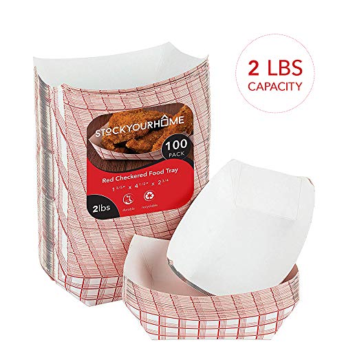 2 Lb Value Pack: Comes with 100 red and white checkered paper trays with a maximum food capacity of 2 pounds. Measure 4.5†Bottom Length, 6.5†Top Length, 2.75†Bottom Width, 4.625†Top Width, 1.75†Height. Good for: hotdogs, corndogs, loaded fries. Quality Paper: Our red & white checkered paper food boats are a great alternative to plastic or foam takeout food containers. Made of premium paperboard, our vintage style checkered food trays are leak resistant - perfect for indoor & outdoor events. Grease Resistant: Keep your hands and clothes mess free! Our food boats have a leak-proof interior coating, so you can enjoy your food without worrying about spillage. A great choice for picnics, barbecues, carnival or circus themed birthday parties. Microwave Safe: Need to reheat your food? No problem - our paper food trays are microwavable, making it easy to heat up food and/or leftovers. Perfect for food stands, food trucks, fast food restaurants, concession stands, and more. Space Saver: Our paper trays are stackable, helping to save on countertop or cabinet space. They are writable too, which can help keep track of orders. When done, simply toss in the trash - our checkered food boats are disposable & recyclable. *Styles may vary.