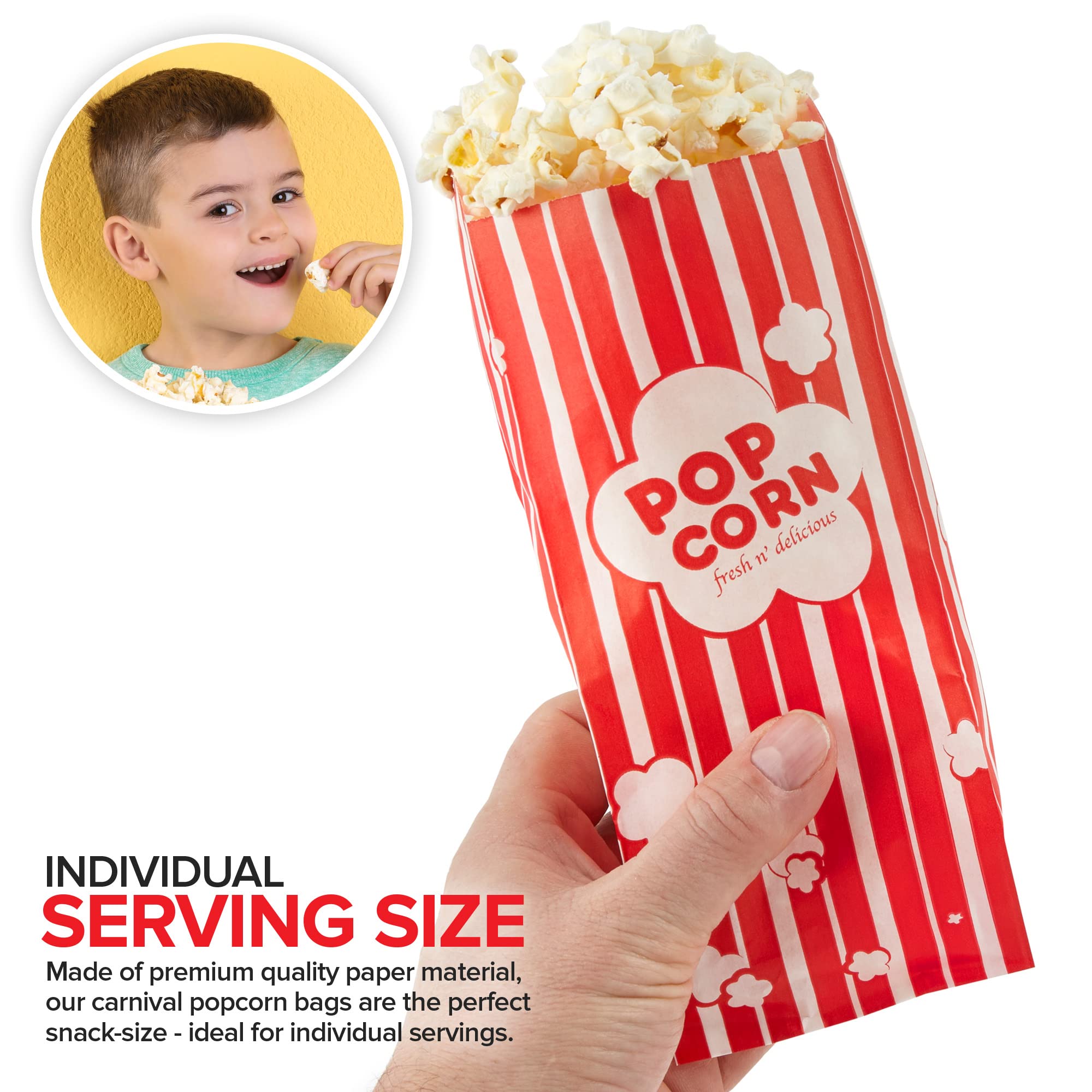 Small Popcorn Bag: Our 1 oz paper party bags are the perfect snack-size - ideal for individual servings. Designed with bold stripes and whimsical illustrations, they'll spark excitement for kids and adults alike