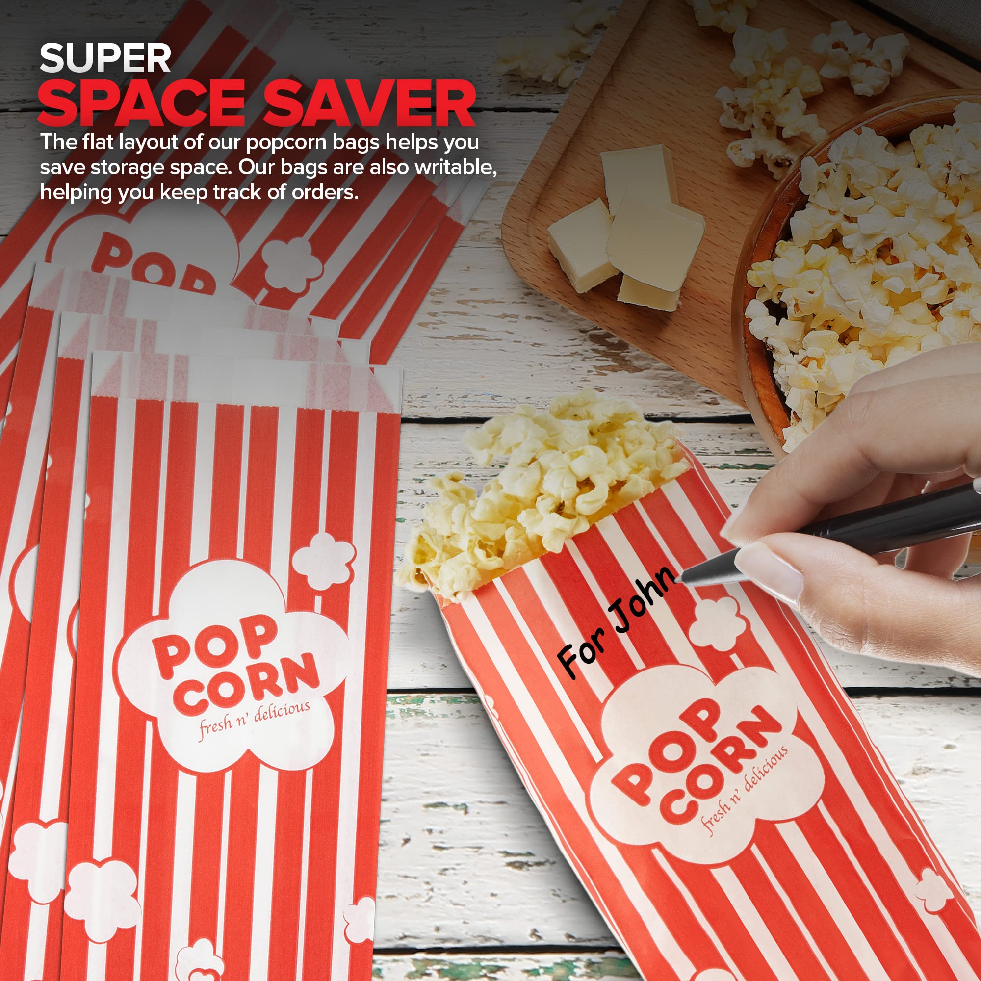 Great Value Pack: Our value pack comes with 100 red and white pop-corn bags with a 1-ounce capacity each. Measures approximately 3.5” Width x 2.25” Gusset Width x 8.75” Height.