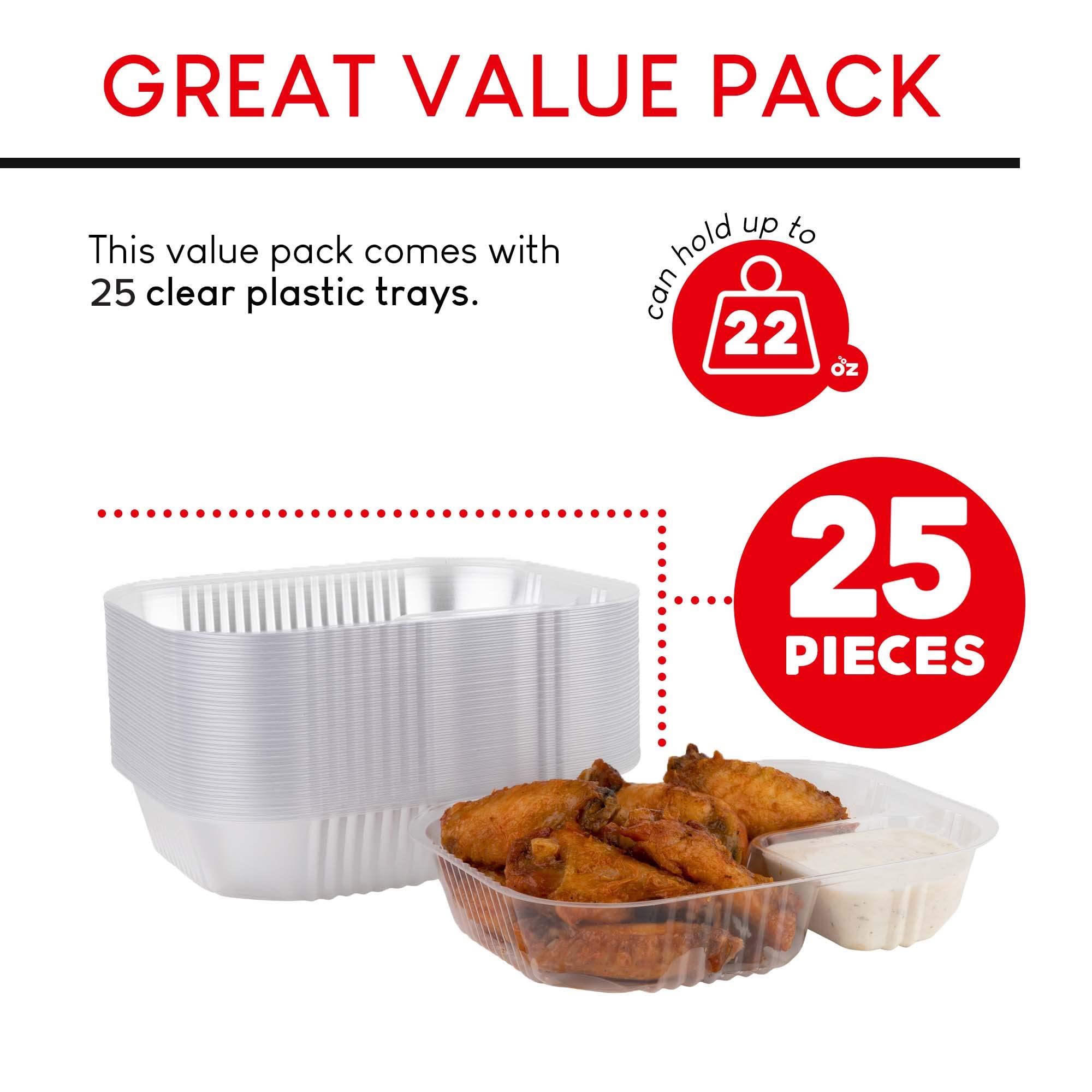 Great Value Pack: Comes with 25 nacho trays. The large compartment holds 19.1oz, and the small compartment holds 3.3oz - a total capacity of 22.4oz. Measures 8” Length x 6” Width x 1.5” Height.