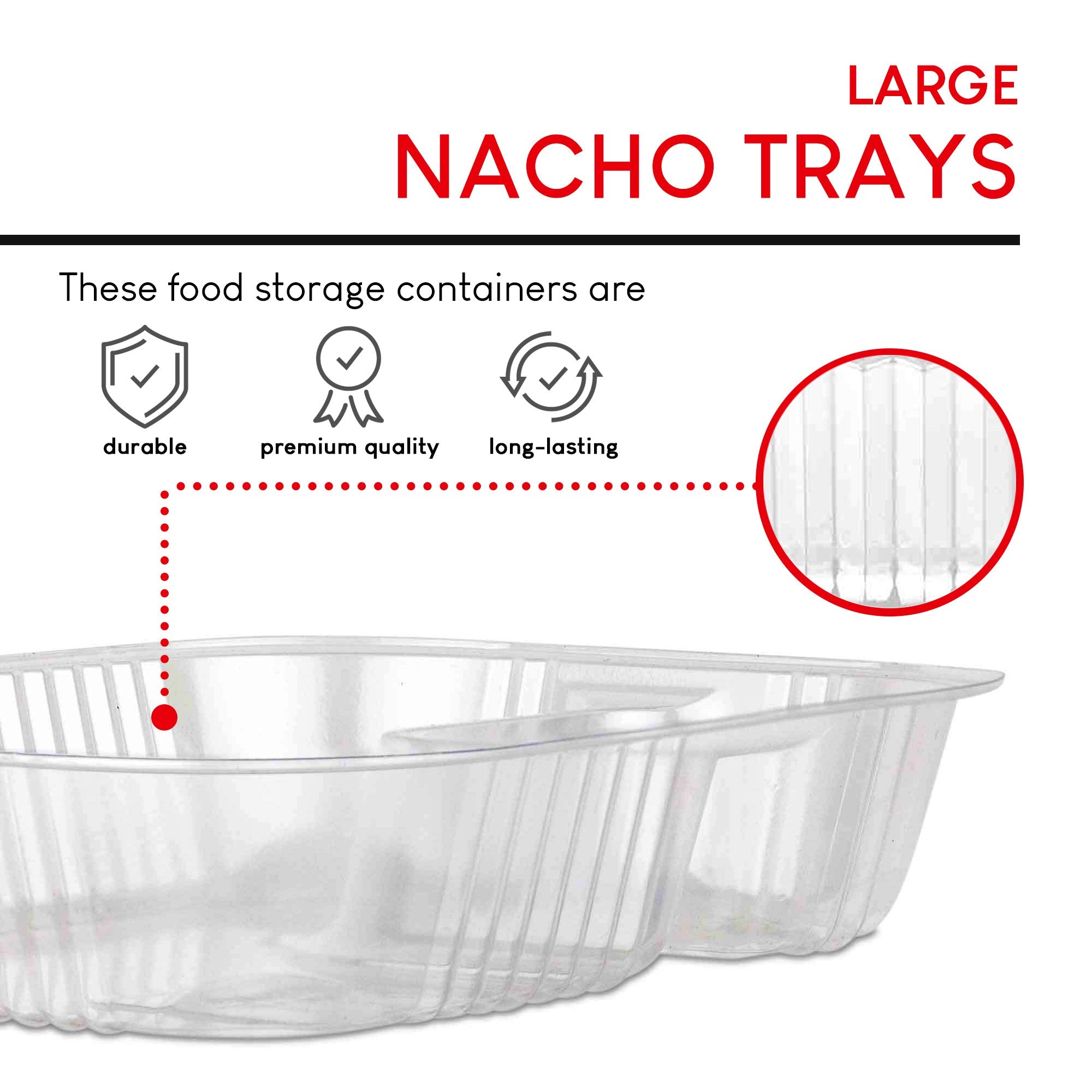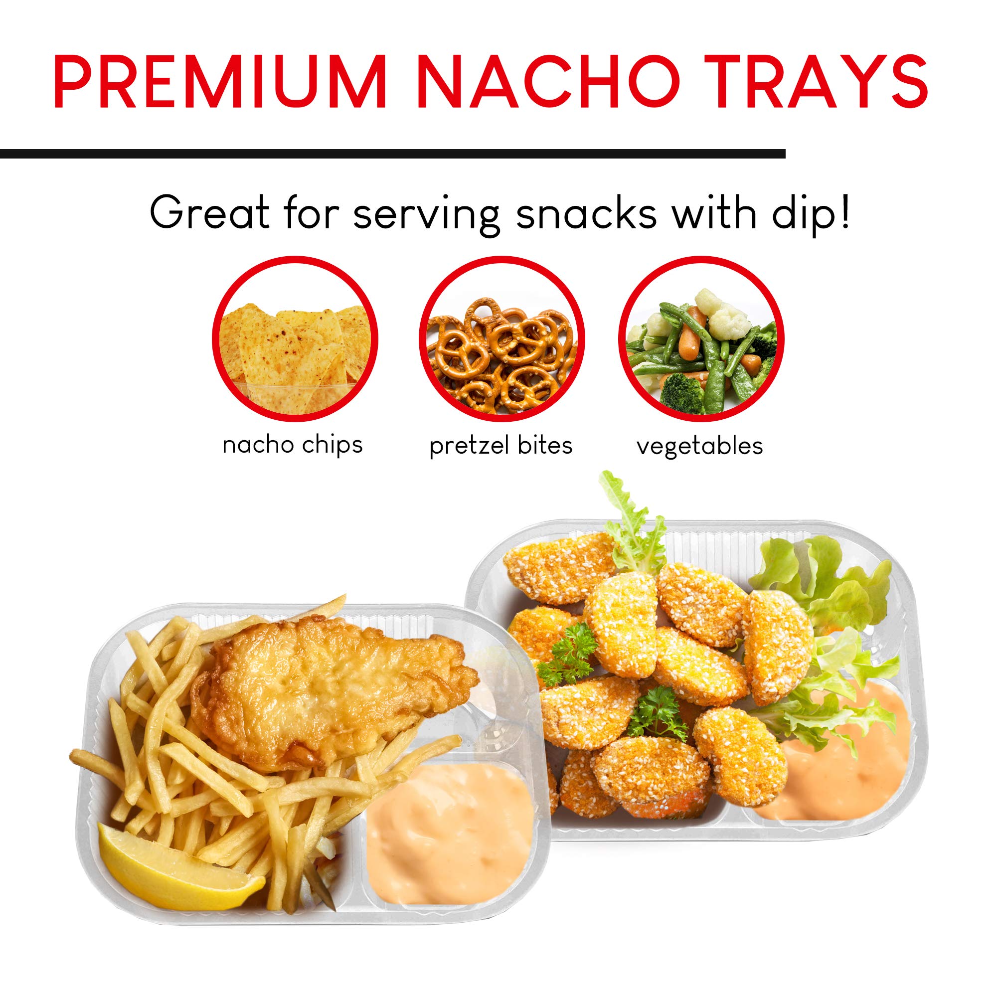 Two-Compartment Trays: Constructed with 2 separate sections, our plastic tray can hold any food and dip combo like nachos & cheese, french fries & ketchup, chicken fingers & bbq sauce, and more!