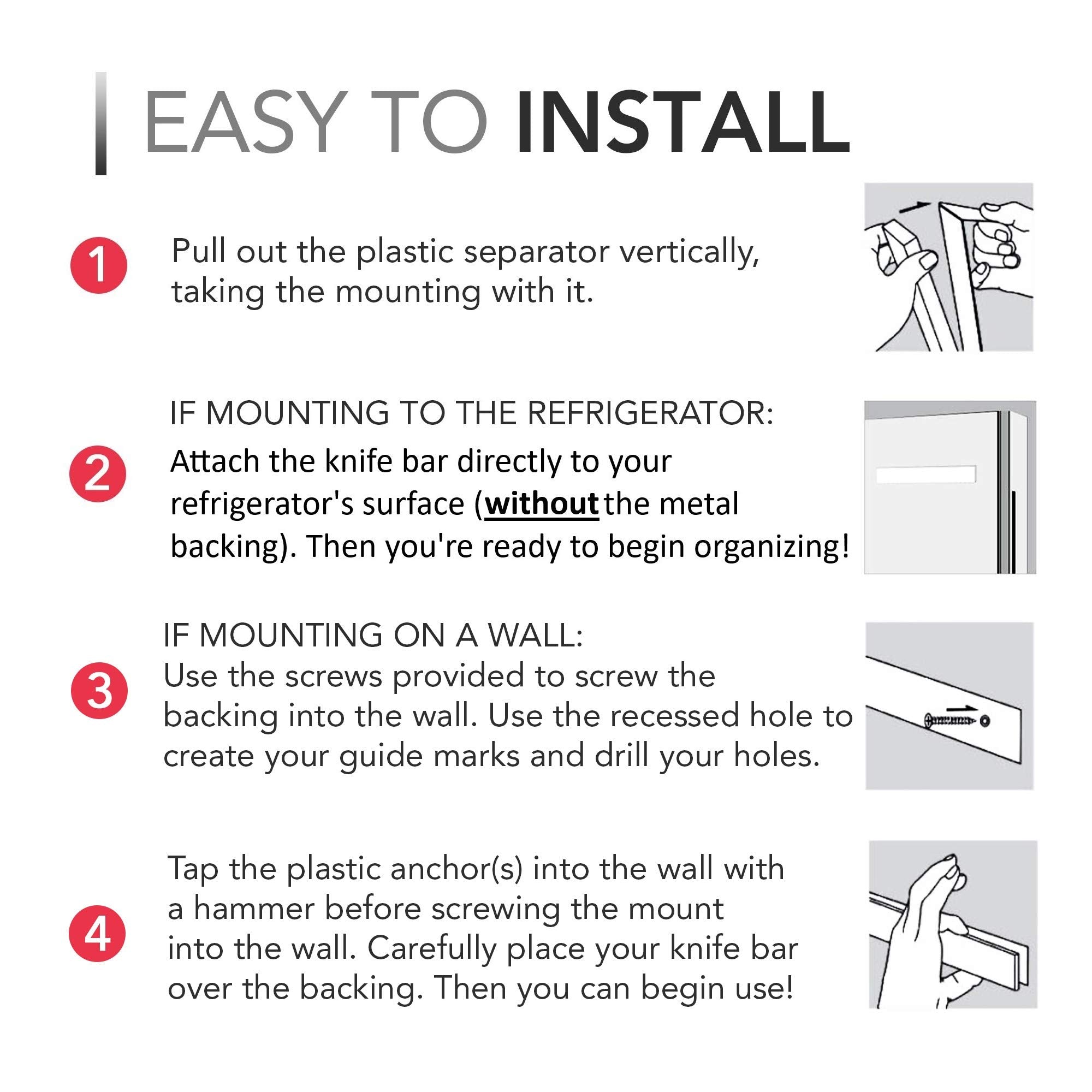 No Tools Required: Forget complicated instructions - install our refrigerator knife strips in no time with just 2 easy steps. First, carefully remove the back plate. Then, place it straight on the side of your fridge. That's it!