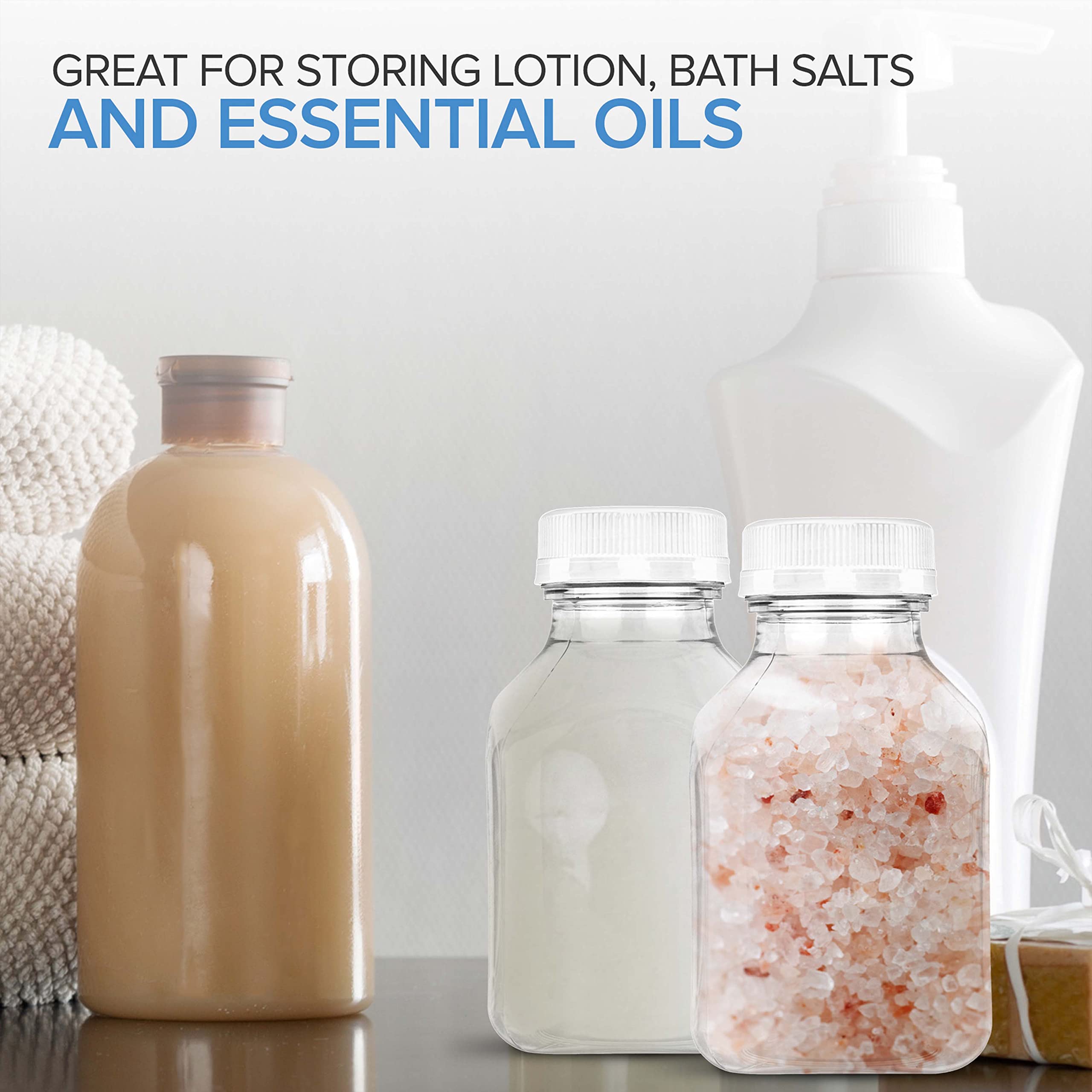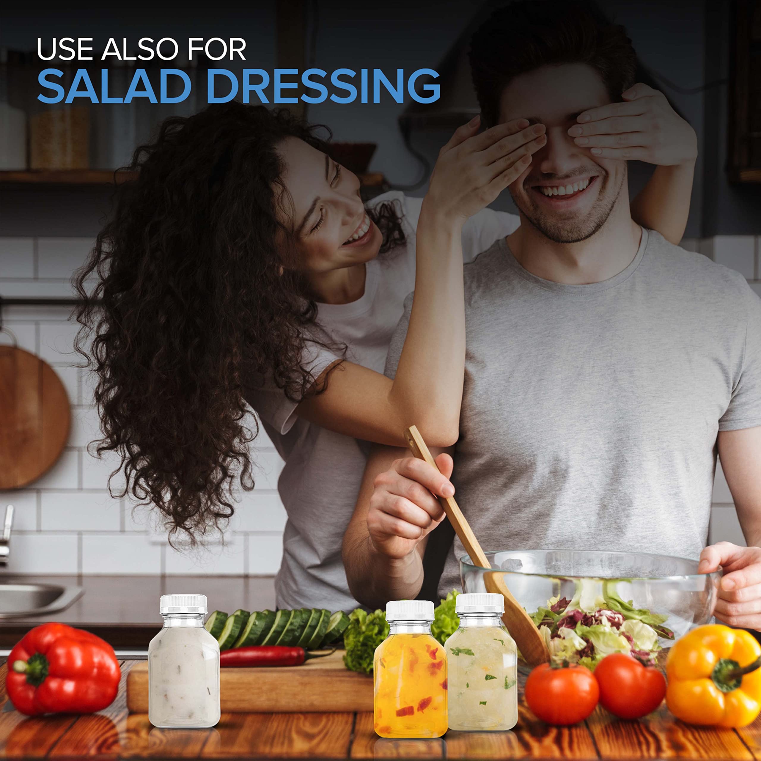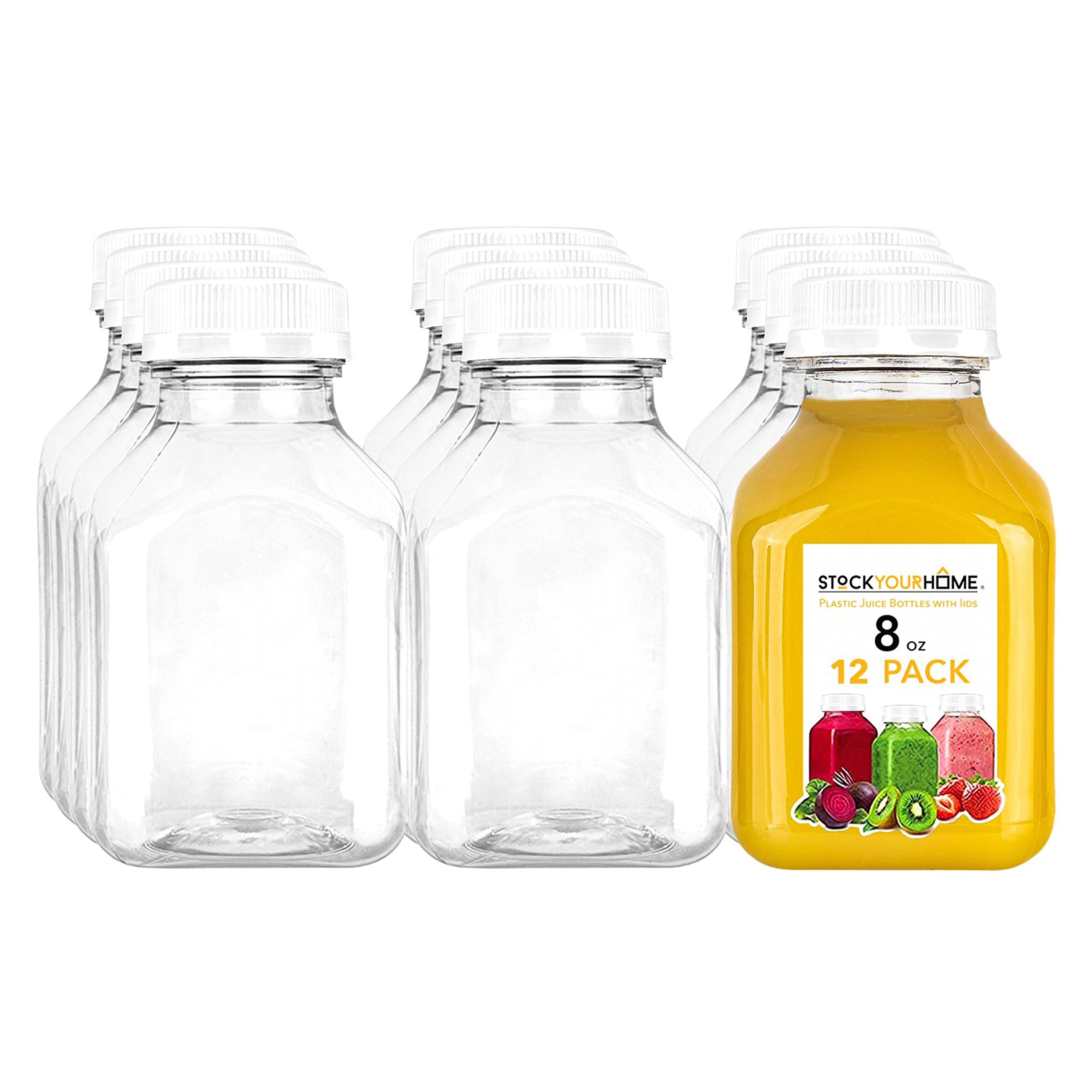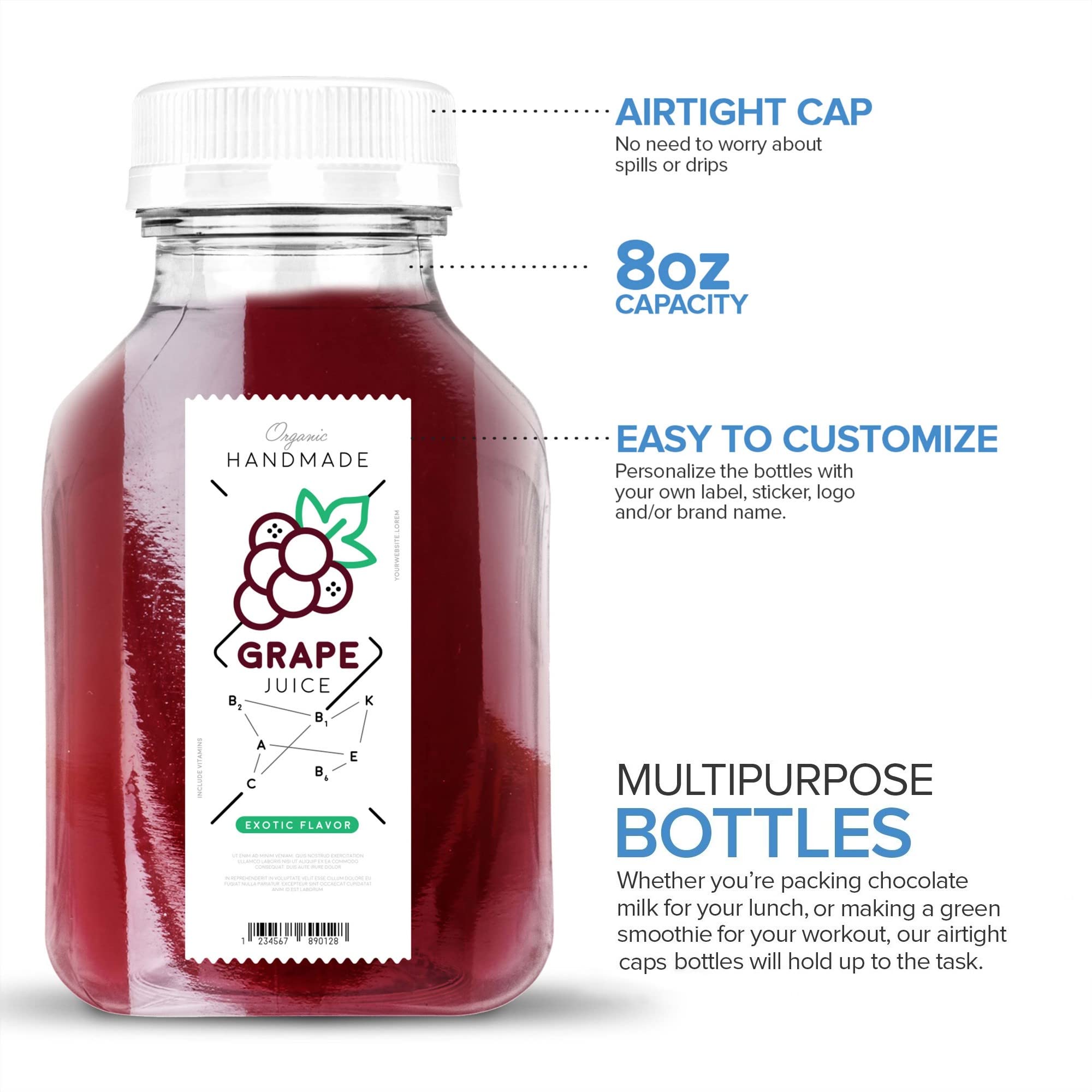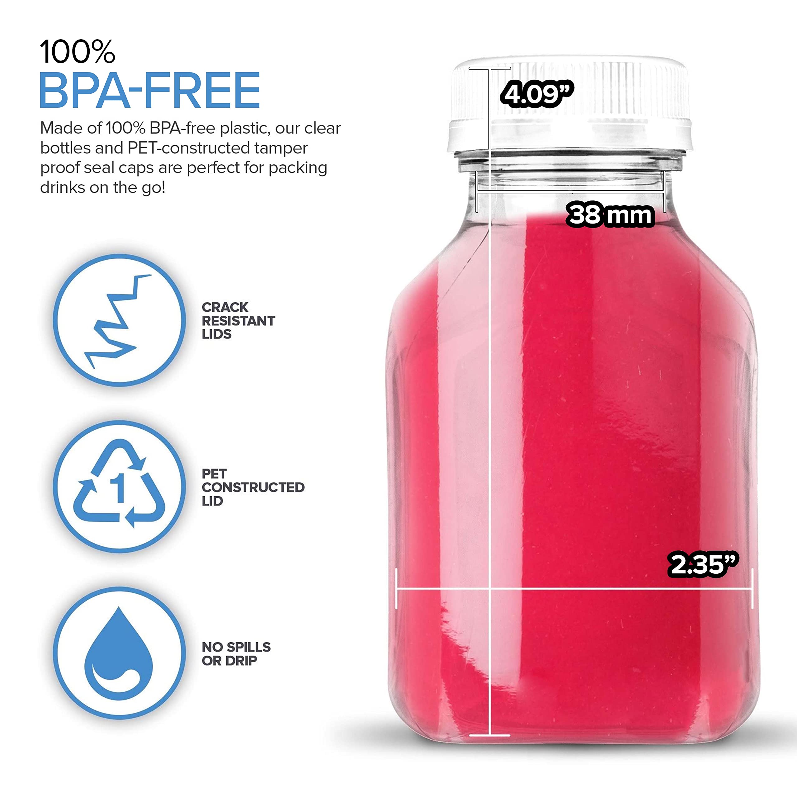 8oz Plastic Bottles with Caps: Our PET smoothie prep containers are 100% BPA-free. Unlike glass, our bottle is light-weight, shatter-proof, and freezer safe. We recommend throwing out our disposable bottles after use. If you plan to reuse our beverage containers, hand-wash well with warm water, soap, and a sponge brush. Our small bottles for drinks are not dishwasher safe.