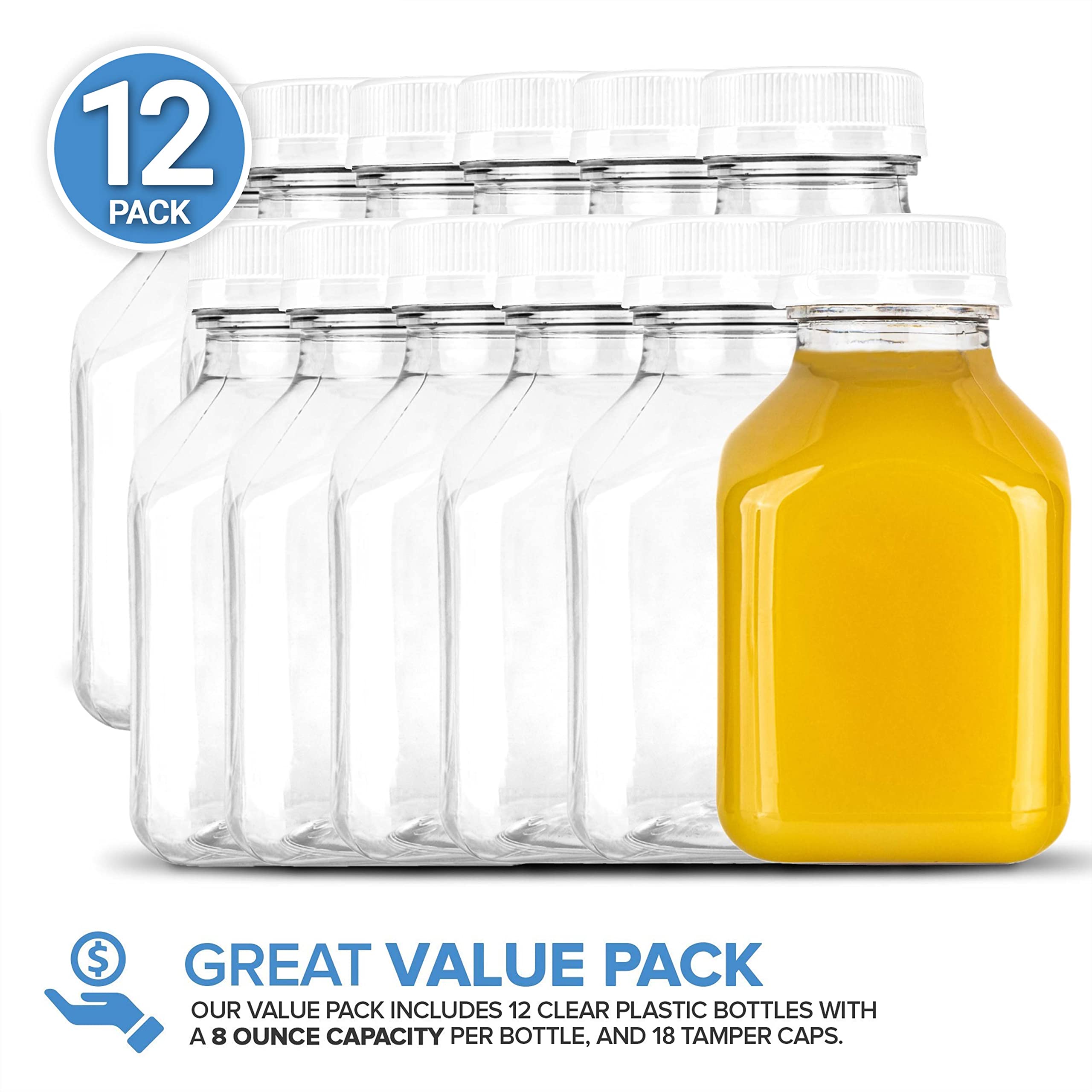 Great Value Pack: Our pack comes with 12 empty bottles for drinks and 12 white tops. Each container has a 8 ounce maximum capacity. Measures approximately 4.09” H x 2.35” Diameter Opening. Hand wash only. Not dishwasher safe.