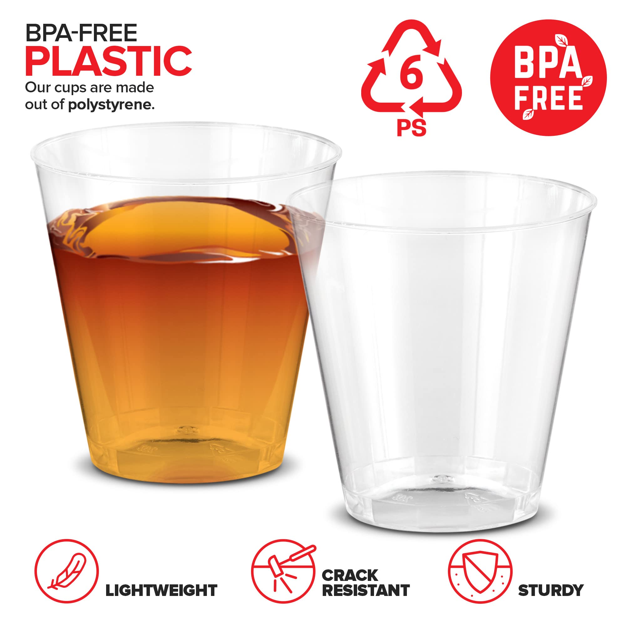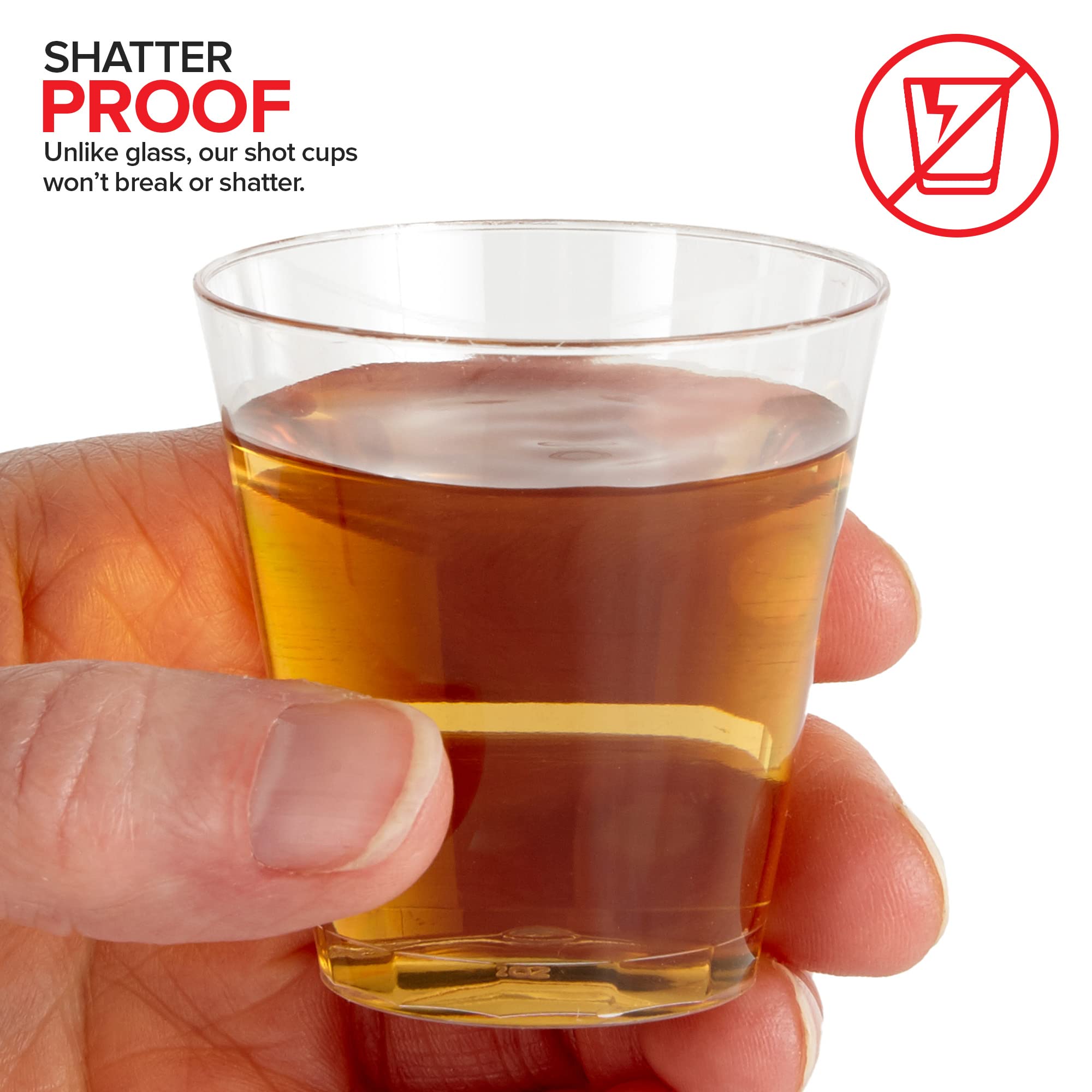 - BPA-Free Plastic: Made from premium polystyrene, our little shot cups are lightweight, sturdy, and durable. They're crack-resistant, and won't shatter like glass. The rolled-rim design also makes them more comfortable for sipping.