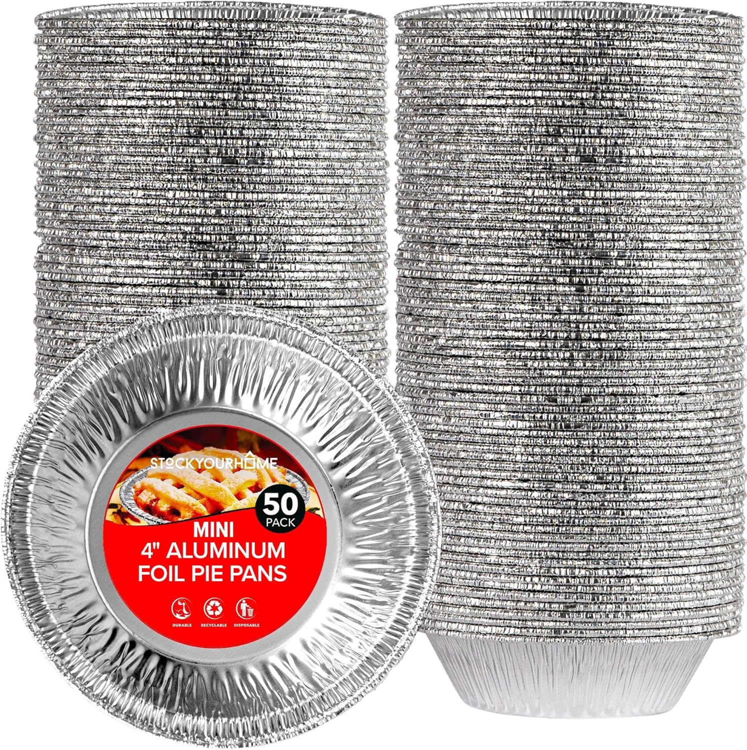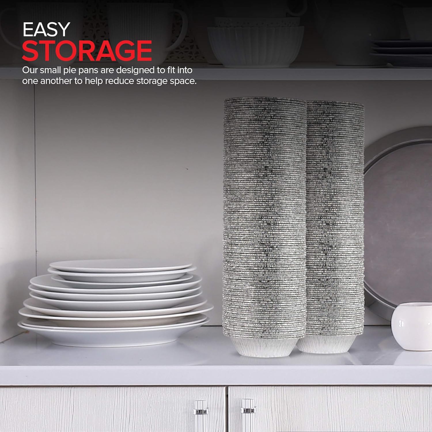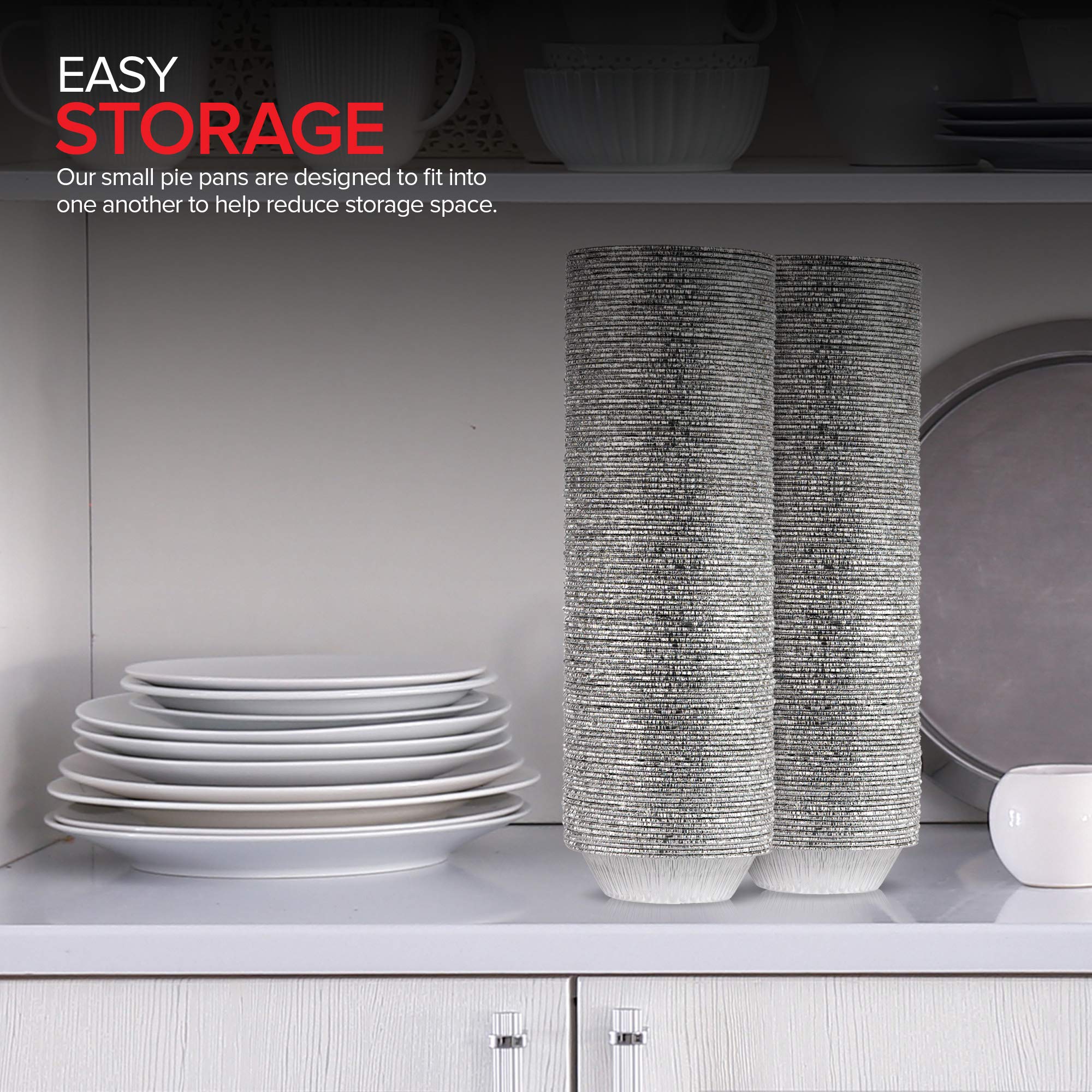 Easy Storage: Our small aluminum pie pans are designed to fit into one another to help reduce storage space - perfect for restaurants, cafes, or bakeries! Cleanup is easy--our small foil pans mini sized are disposable and recyclable.