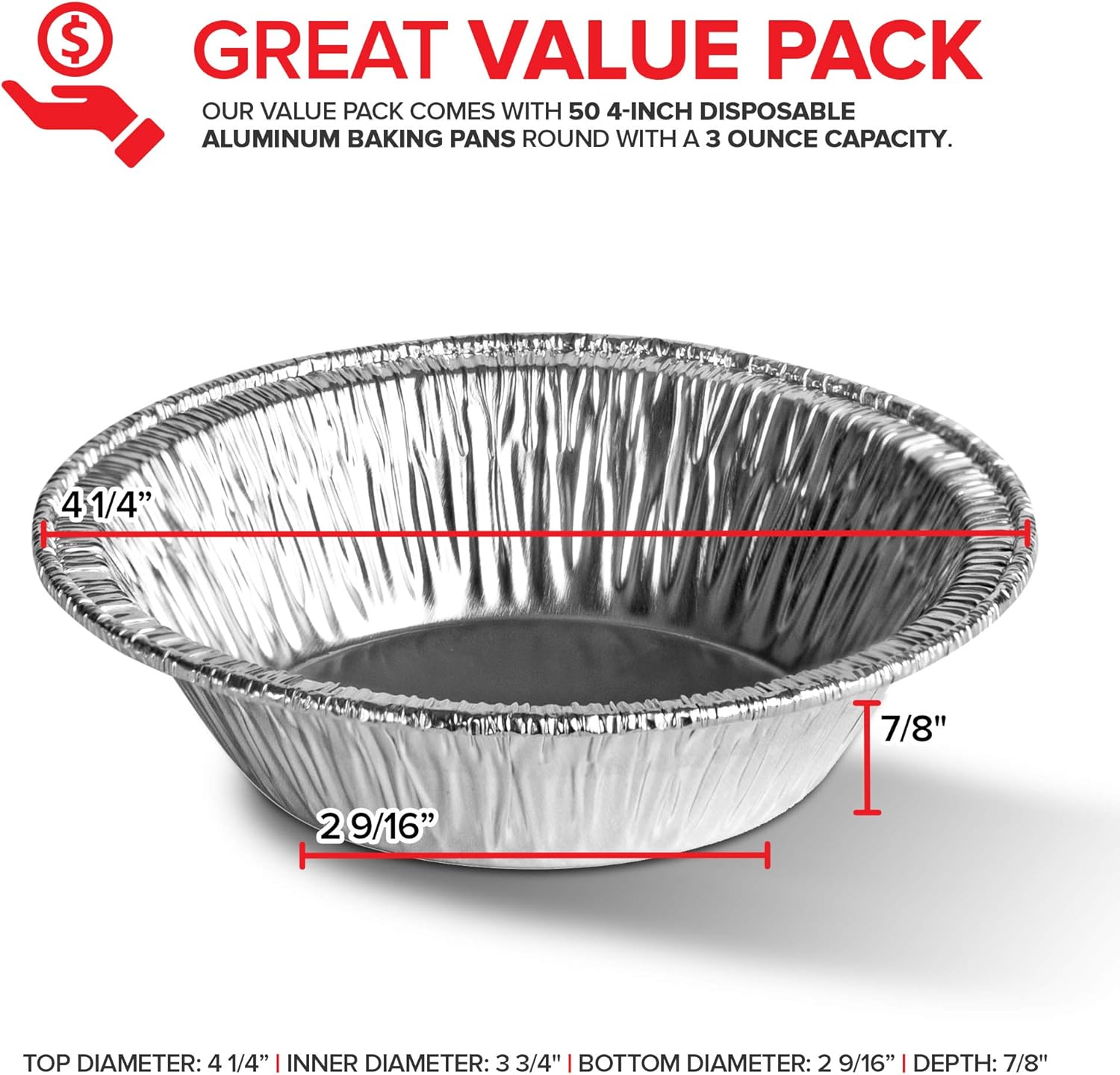 Great Value Pack: Our bulk mini pie tins value pack comes with 50 4-inch disposable round aluminum baking pans with a 3 ounce capacity. Top Diameter: 4” Inner Diameter: 3 3/4" Bottom Diameter: 2 1/2” Depth: 3/4"