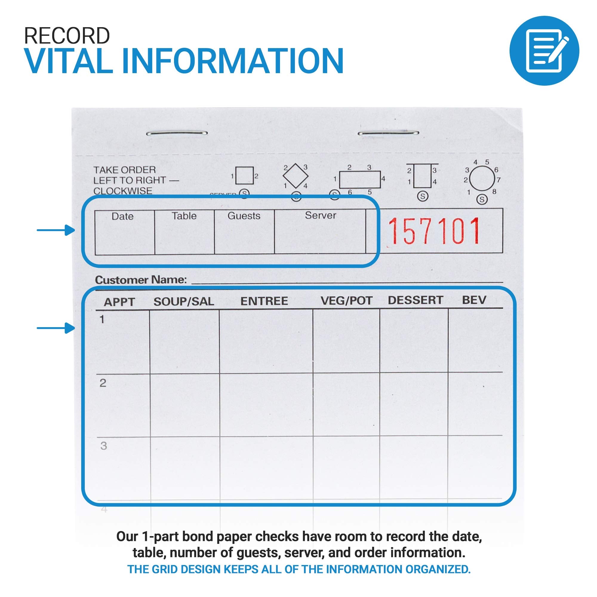 - Record Vital Information: Our 1-part bond paper checks have room to record the date, table, number of guests, server, and order information. The grid design keeps all of the information organized.