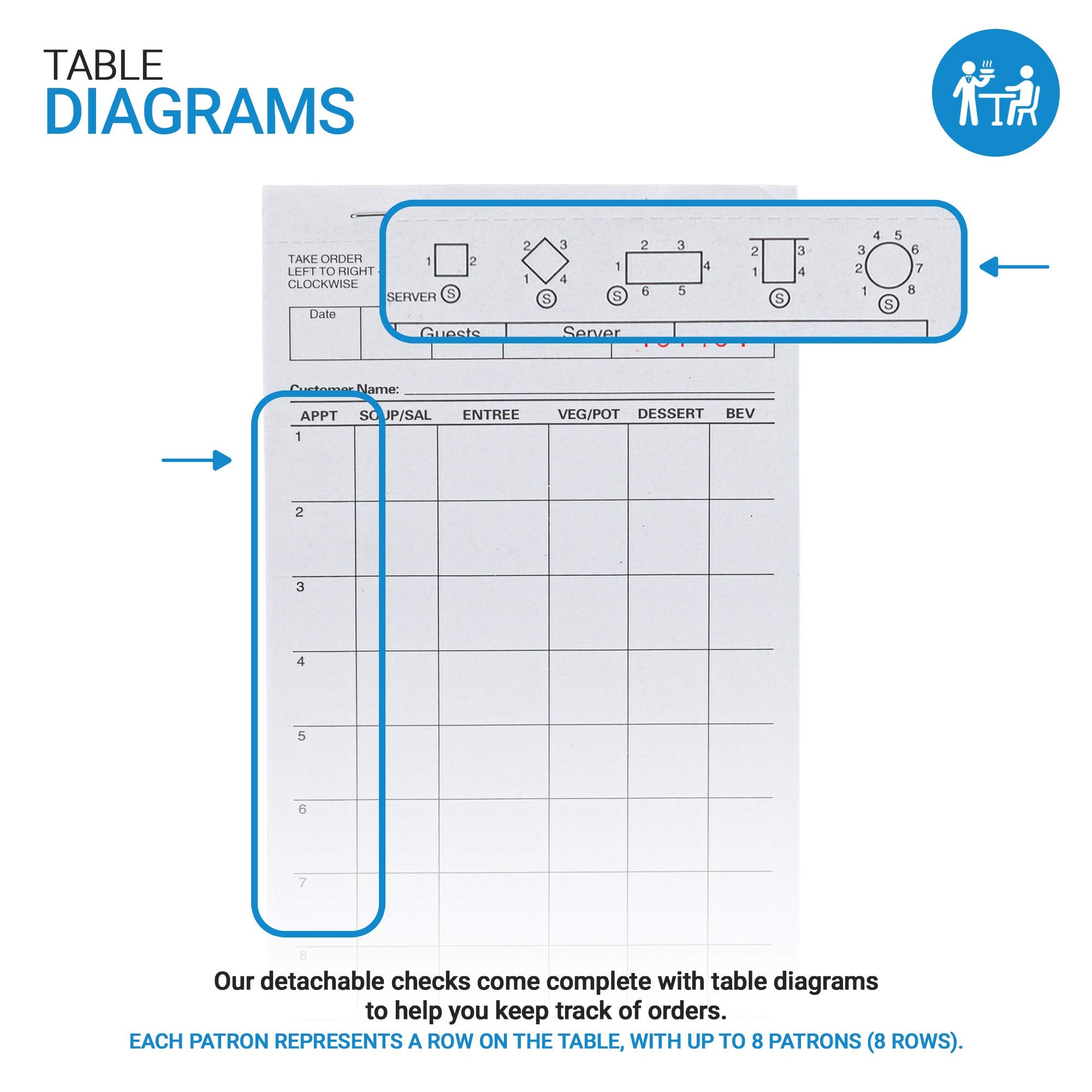 - Detachable Checks: Designed with a perforated line, our guest checks rip easily and neatly from the booklet. It also comes complete with table diagrams to help you keep track of orders. Each patron represents a row on the table, with up to 8 patrons (8 rows).