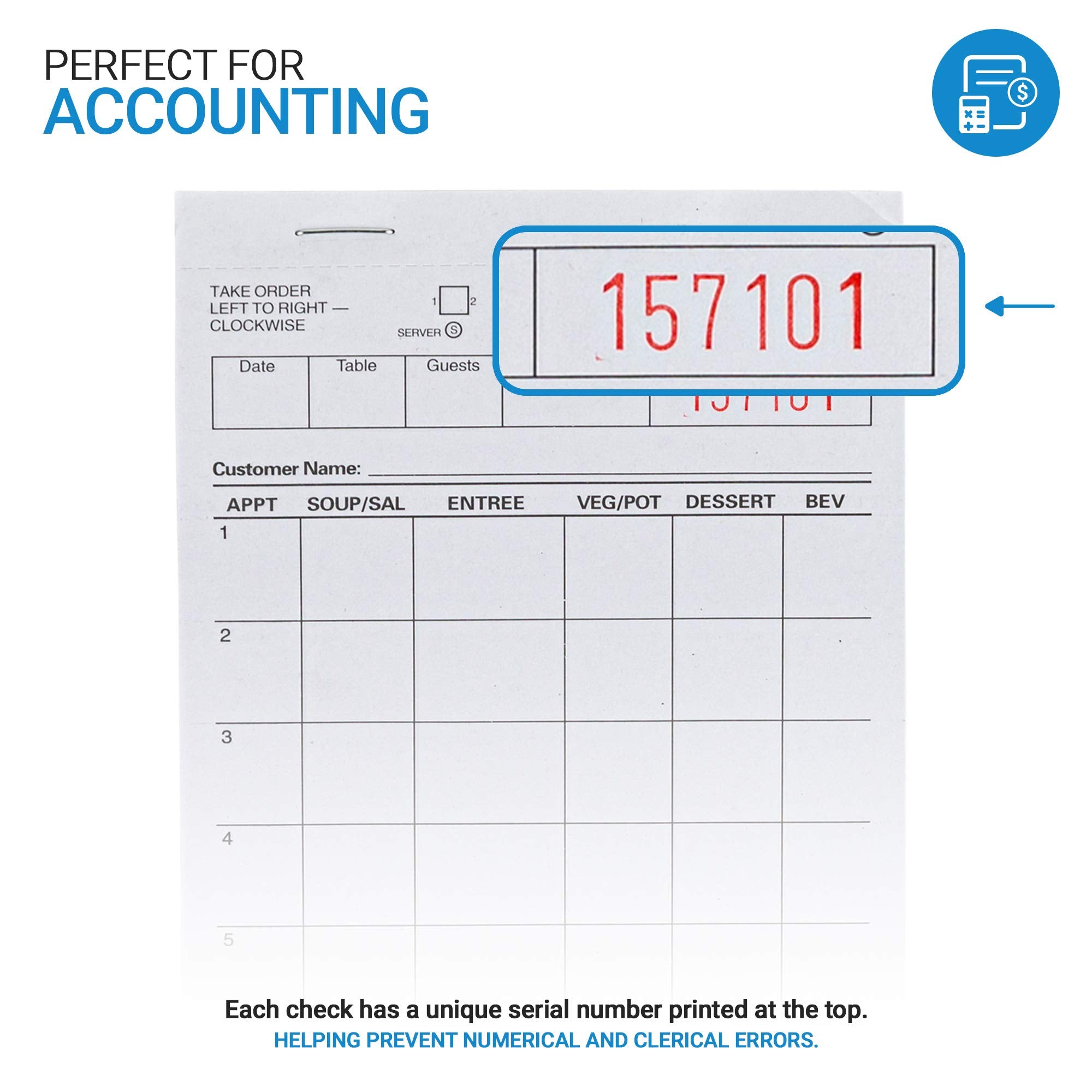 - Perfect for Accounting: Each check has a unique serial number printed at the top, helping prevent numerical and clerical errors. Perfect for restaurants, diners, food trucks, takeout and delivery services, and more!
